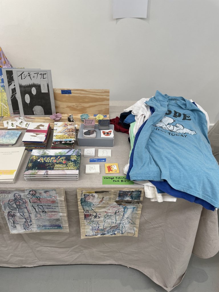 We are selling T-Shitrs, ZINE, Postcards, Stickers, Sculpture, Ceramics, Drawings, vintage stuff etc..