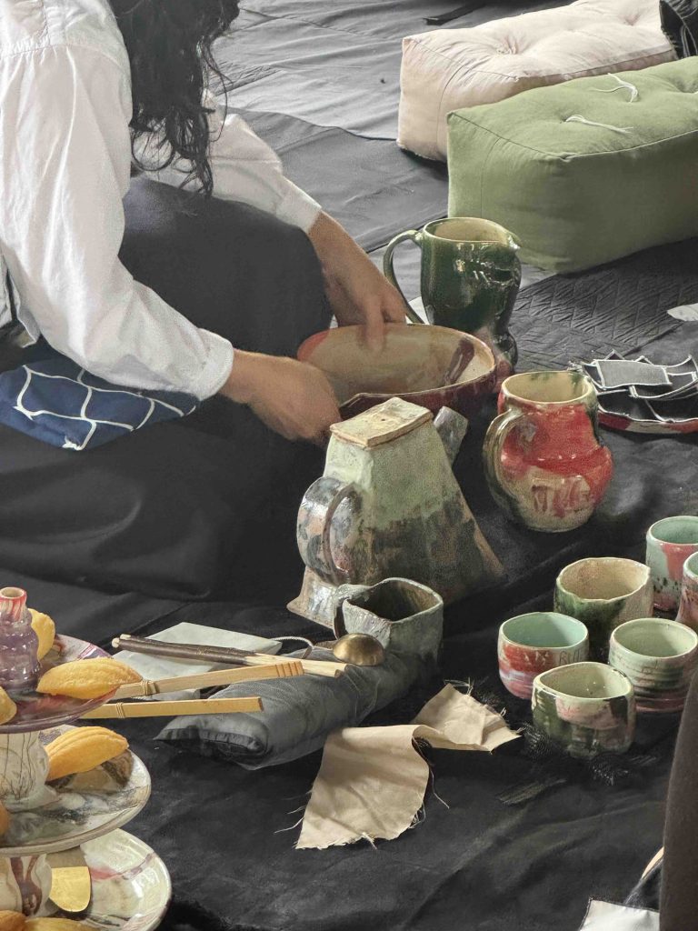 A craft table will also be available for those who wish to create items to exchange on-site. The theme of this edition is the Five Elements—wood, water, fire, metal, and earth—rooted in Daoist philosophy, where all beings exist in dynamic balance. Ceramicist Jennie Jieun Lee contributes a series of original teawares which reflect these elements in conversation. The visual environment, designed and created by Shoji from discarded materials sourced in the Garment District, features a patchworked black textile tea space inspired by Chinese cosmological diagrams and the traditional tearoom’s Tatami mat layout.